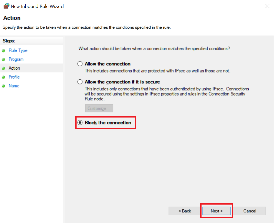10- در مرحله بعد بر روی Block the connection کلیک کنید و سپس بر روی Next کلیک کنید.